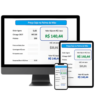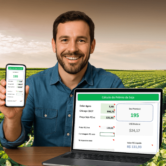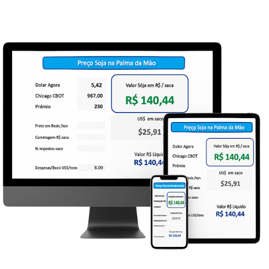 Você terá em mãos uma ferramenta simples, com o mesmo resultado que a dos compradores de grãos do Brasil inteiro, eles não querem que você use, mas fique tranquilo, de forma rápida e segura, essa planilha em excell pode ser sua, com ações rápidas e simples, se tornará impossível você não saber o seu preço do soja, digitando de forma simples, infomações como CBOT, Dolar, Prêmio e Basis da sua região num piscar de olhos.